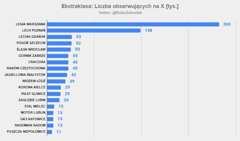 Na dawnym Twitterze sytuacja podoba do Facebooka, czyli ogromna przewaga Legii Warszawa (ponad 150 tys. obserwujących) nad drugim Lechem Poznań, który zgromadził niecałe 200 tys. osób. Cztery razy mniej obserwujących ma Lechia Gdańsk, Pogoń Szczecin i Śląsk Wrocław, które rywalizują o trzecie miejsce. Pięć najsłabszych klubów ma mniej niż 20 tys. obserwujących. W tym gronie są tegoroczni beniaminkowie – GKS Katowice i Motor Lublin.