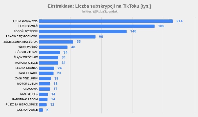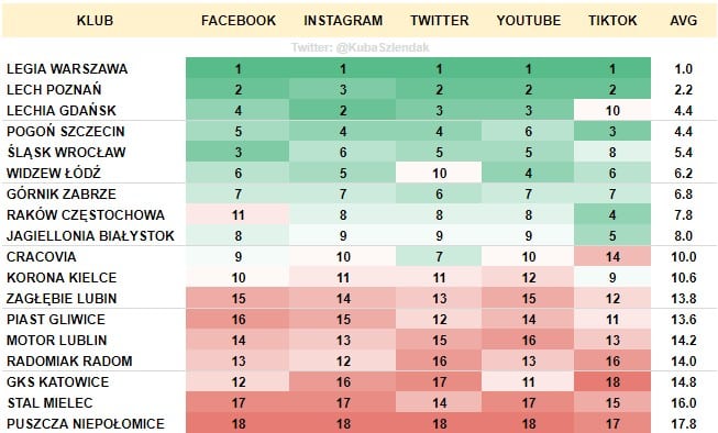 Widzew Łódź zdecydowanie ma rezerwy na Twitterze, gdzie zajmuje dopiero 10. miejsce, Lechia Gdańsk na TikToku, a Raków Częstochowa na Facebooku. Dość słabe wyniki notują Radomiak Radom i Stal Mielec, które w najwyższej lidze są obecne od kilku sezonów. Ciekawy będzie rozwój pod tym względem drużyn z Katowic i Lublina, czyli z dużych ośrodków, które przez wiele lat były poza Ekstraklasą. To tam powinniśmy spodziewać się największych wzrostów.