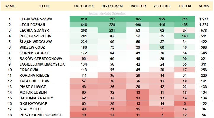 Legia Warszawa prowadzi na każdej platformie, często z dużą przewagą nad pozostałymi zespołami. Poza Instagramem, Lech Poznań wszędzie zajmuje 2. miejsce. Ciekawe wyniki notuje Lechia Gdańsk, czyli tegoroczny beniaminek. Poza TikTokiem, gdzie jest sklasyfikowana na 10. pozycji wszędzie znajduje się w top4. Dobre wyniki można zauważyć także w przypadku Pogoni Szczecin i Śląska Wrocław. Równe rezultaty notuje Górnik Zabrze, który często wykorzystuje do promocji Lukasa Podolskiego oraz Jagiellonia Białystok.