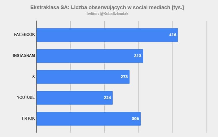 Swoje profile w social mediach ma także Ekstraklasa jako spółka zarządzająca najwyższą ligą. Porównując jej wyniki do klubów na Facebooku miałaby 3. miejsce, na Instagramie i X 2., ale na YouTube i TikToku byłaby liderem. Jednoznacznie to pokazuje, że odpowiednio wcześniej dostrzeżono trend związany z materiałami video, a sam content jest kierowany w dużej mierze do młodszej widowni, czyli tej z TikToka.