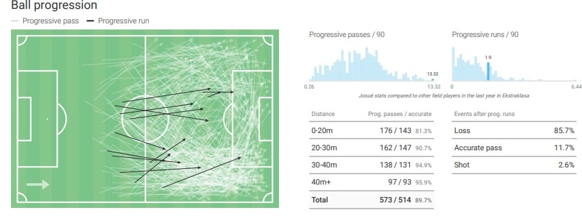 - pod kątem liczby prostopadłych podań Josue jest pierwszy (49) pod kątem podań w ofensywną tercję boiska jest drugi (255, lepszy tylko Dąbrowski)
