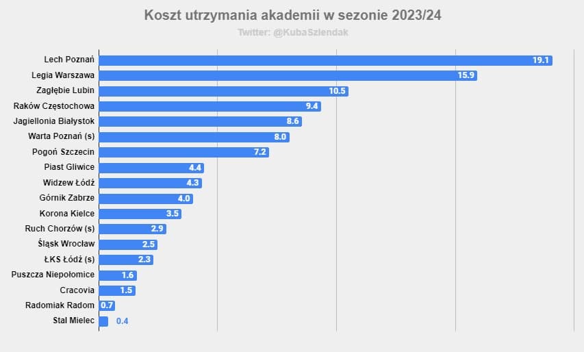 Najwięcej kosztuje utrzymanie akademii Lecha Poznań – ponad 19 mln zł rocznie. Kolejne w zestawieniu są akademie Legii Warszawa (15.9 mln zł) i Zagłębia Lubin (10.5 mln zł). Łącznie kluby Ekstraklasy przeznaczyły na ten cel prawie 107 mln zł, czyli 9% przychodów.