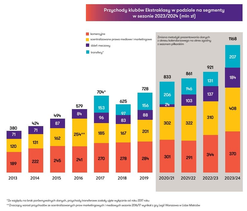 Jak czytamy w raporcie, badanie obejmuje okres od 1 lipca 2023 roku do 30 czerwca 2024 roku, czyli sezon 2023/24. Dane finansowe pochodzą od klubów, a publikacja nie jest audytem. Dokumenty nie były objęte badaniem w rozumieniu “Ustawy o biegłych rewidentach” ani innych regulacji dotyczących badania sprawozdań finansowych. Raport skupia się głównie na przychodowej stronie funkcjonowania klubów, co jest dużym uproszczeniem. W zestawieniu nie ma też wykazu środków publicznych, które trafiły do klubów w poprzednim sezonie, a wiemy, że jest to kluczowy czynnik porównawczy między klubami, bo w czasie, kiedy jeden klub musi utrzymywać duże zespoły pracowników, którzy pozyskują sponsorów, drugi może otrzymać miliony jedną decyzją podjętą w urzędzie miasta.