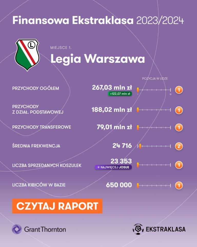 Dominację przychodową Legii dobrze obrazują udziały jej wyników w sumie dla całej ligi. Warszawianie odpowiadali w sezonie 2023/24 za: