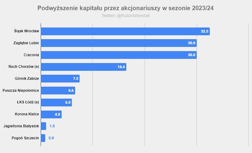 Prawie 135 mln zł popłynęło do 10 klubów w ramach podwyższenia kapitału od udziałowców, w tym 6 klubów ma w akcjonariacie wysoki udział gmin czy spółek skarbu państwa. Poza tymi środkami kluby otrzymują wpływy ze sponsoringu ze strony SSP czy z tytułu promocji od miast. Niestety nie poznaliśmy dokładnych kwot, które trafiają do klubów, jednak patrząc na głównych partnerów ligi oraz klubów można śmiało stwierdzić, że Ekstraklasa jest w dużym stopniu zależna od środków publicznych. Poniższe środki nie są wykazywane w przychodach klubów.