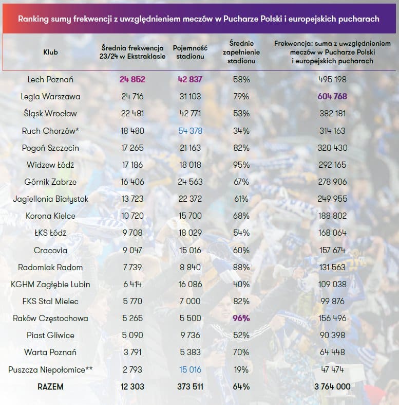 - Legia Warszawa 292 tys. widzów średnio na mecz,