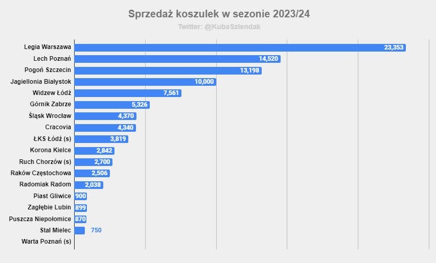 Środki związane z dniem meczowym to także gadżety, a wśród nich najważniejszy atrybut kibica piłkarskiego obok szalika – koszulka. Kluby Ekstraklasy sprzedały ich w poprzednim sezonie 99 992 sztuki (nie licząc Warty Poznań, która nie podzieliła się danymi). Niemal co czwarta miała barwy Legii Warszawa, a kolejne 28% kolory Lecha Poznań lub Pogoni Szczecin. Bardzo dobrym wynikiem może pochwalić się Jagiellonia, która samej koszulki okolicznościowej z okazji mistrzostwa Polski sprzedała w ilości 10 tys. sztuk. ŁKS Łódź, czyli beniaminek i spadkowicz sprzedał więcej koszulek niż 9 klubów, a Raków Częstochowa, czyli jeden z najlepszych sportowo klubów w Polsce zanotował dopiero 12. wynik. Warto zaznaczyć, że w bieżącym sezonie Cracovia sprzedała już ponad 3 tys. koszulek, więc najprawdopodobniej poprawi swój zeszłoroczny wynik.
