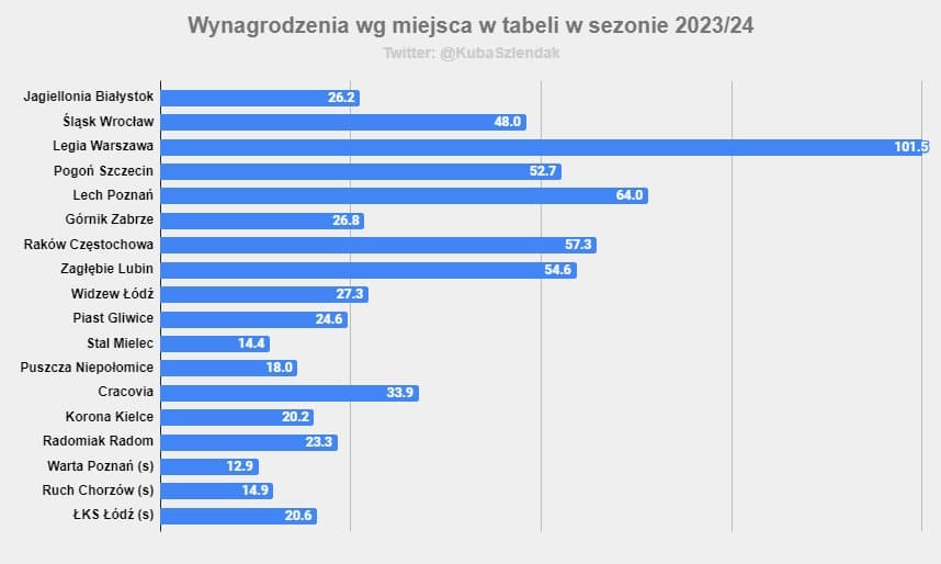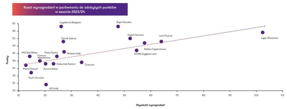 Legia miała też zdecydowanie najwyższy przelicznik wynagrodzeń na punkty w lidze, wyniósł 1.72 mln zł. Kolejne zespoły w zestawieniu to Lech i Zagłębie z wynikiem na poziomie 1.21 mln zł i 1.16 mln zł.