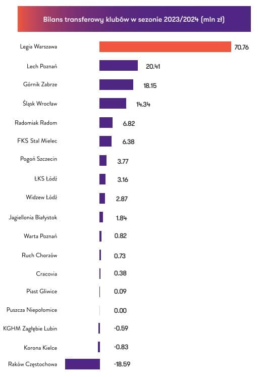 - 79 mln zł przychodów transferowych (1. miejsce w lidze),