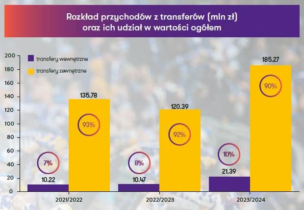 Zdecydowanie więcej środków kluby uzyskują na sprzedaży zawodników do klubów zagranicznych (90%). W poprzednim sezonie było to rekordowe 185 mln zł, czyli o połowę więcej niż w sezonie 2022/23.