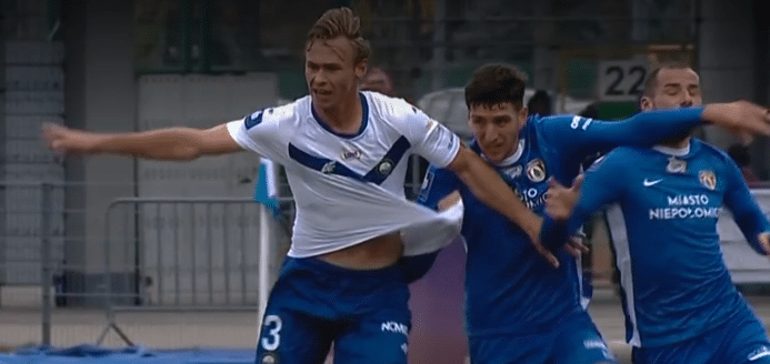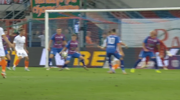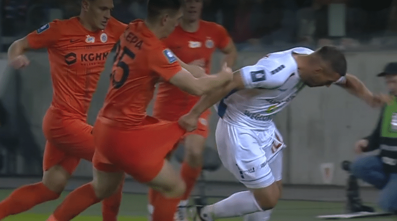Mało niepodyktowanych rzutów karnych? Idźmy dalej – zaczynając od pierwszej kolejki, gdzie obrońca Motoru ładuje się w plecy Tudora, a później jeszcze podcina go nogami podczas własnego upadku. Nie ma tutaj mowy o grze bark w bark, bardziej mowa tu o grze barkiem w plecy przeciwnika. Brak rzutu karnego.