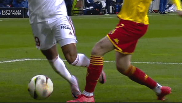 Kolejna sytuacja z cyklu „ale jak?”. Wyobraźcie sobie bowiem, że tutaj Diaby-Fadiga nie został żółtej kartki. Napomnienie jak z podręcznika, sędzia widzi wszystko jak na dłoni, ale kartki nie daje i tylko ostrzega napastnika Jagi. A byłaby to dla niego już druga żółta kartka. Korkami po kolanie – brak kartki… Irracjonalna zachowawczość sędziego Stefańskiego.