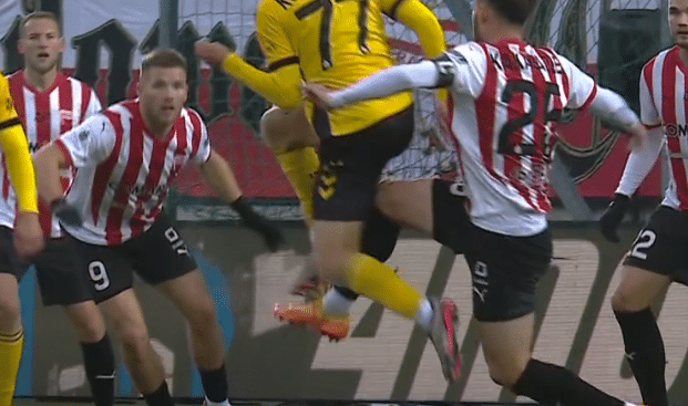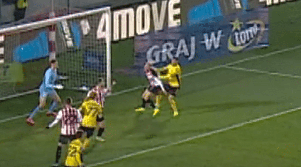 Po tym rzucie wolnym padł gol na katowiczan. A po tym pchnięciu Biedrzyckiego GKS miał akcję, która zakończyła się golem na 4:3 w ostatnich sekundach spotkania.