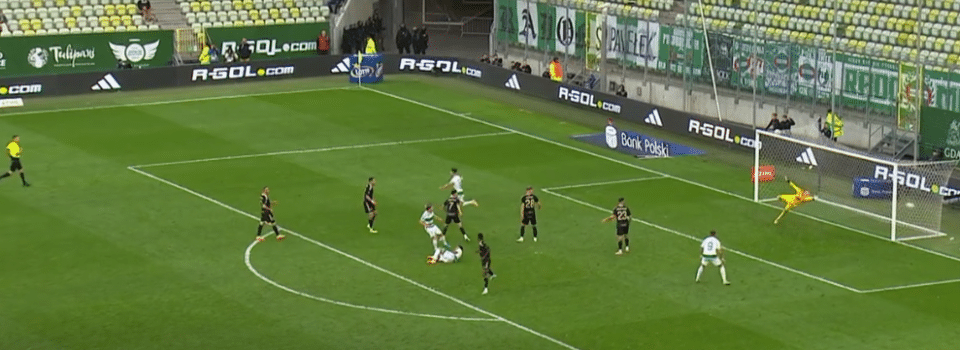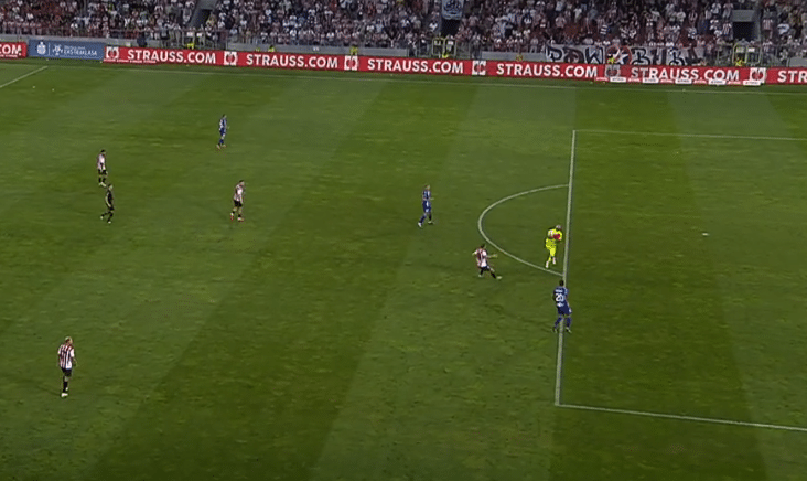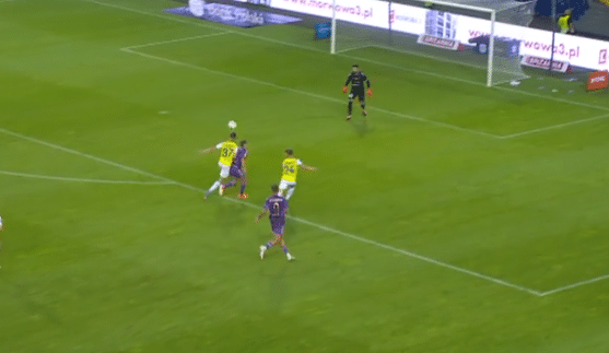 Tutaj pchnięcie jest wyraźne, Biedrzycki ledwo utrzymuje równowagę i pędzi później za piłką, do której jest spóźniony. Krótka sekwencja podań doprowadza do strzału, który kończy się golem. Sędzia nie zobaczył tego z boiska, sędziowie VAR nie interweniowali. O ile przy Kowalczyku wóz VAR był bezradny, o tyle tutaj mógł uratować kolegę z gwizdkiem.