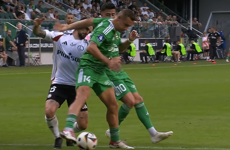 Pomocnik legionistów próbuje walczyć o piłkę, ale Polak przerysowuje mu stopę, kładzie korki gdzieś w okolicach pięty i wyłącza rywala z gry. Reakcja Szymona Marciniaka? Brak. A mówimy o kluczowej sytuacji dla losów spotkania w końcówce tego meczu.