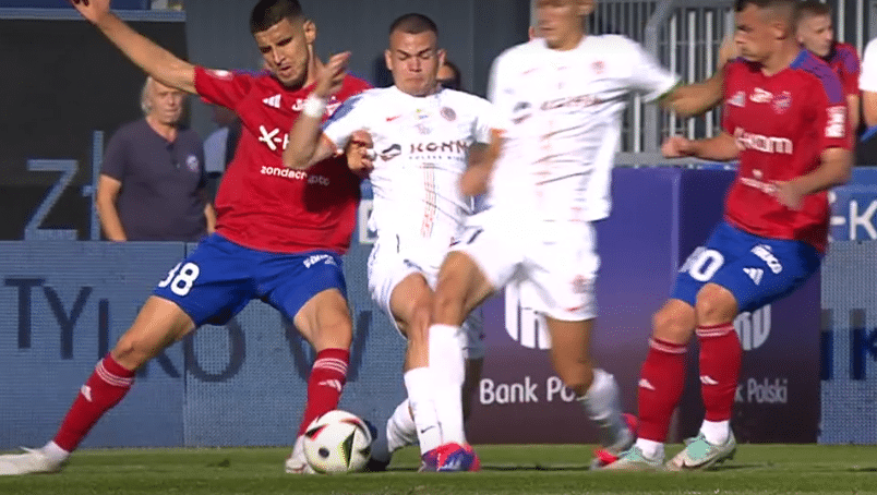 Bardzo zbliżoną sytuację oglądaliśmy też w meczu Jagiellonii z Zagłębiem Lubin. Tam też stempel postawiony na stopie przeciwnika nie spotkał się z żadną reakcją arbitra. Kolejny klarowny rzut karny w walce o piłkę, kolejny milczący gwizdek arbitra.