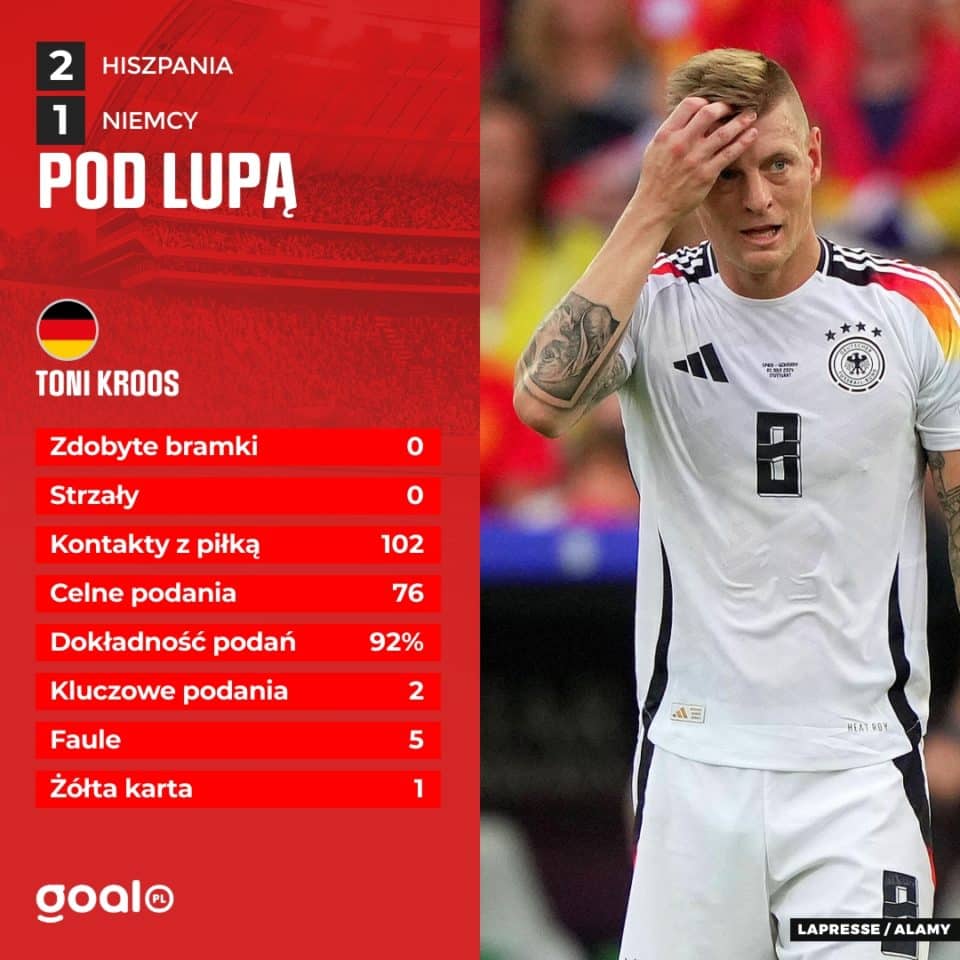 Początek Euro 2024 był bardzo dobry w wykonaniu reprezentacji Niemiec, jak i samego Toniego Kroosa. Bezapelacyjnie był liderem swojego zespołu i jednym z najlepszych zawodników turnieju. Wystarczy powiedzieć, że przed meczem z Hiszpanią mógł się pochwalić 95% dokładnością podań (411 celnych na 431 podań). Był również liderem na Euro 2024 pod względem liczby podań przełamujących linie. Takich posłał 125.