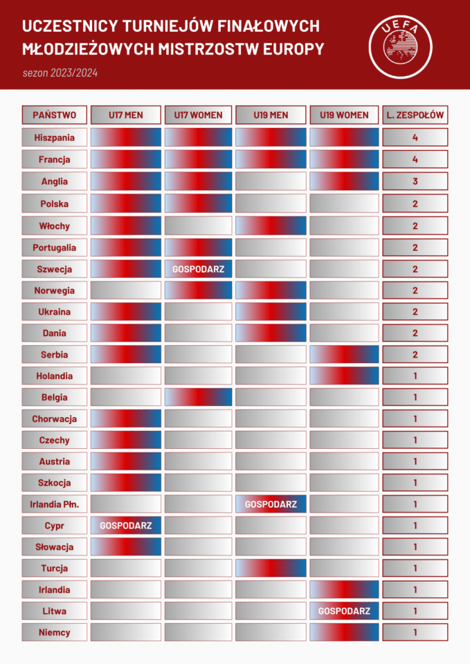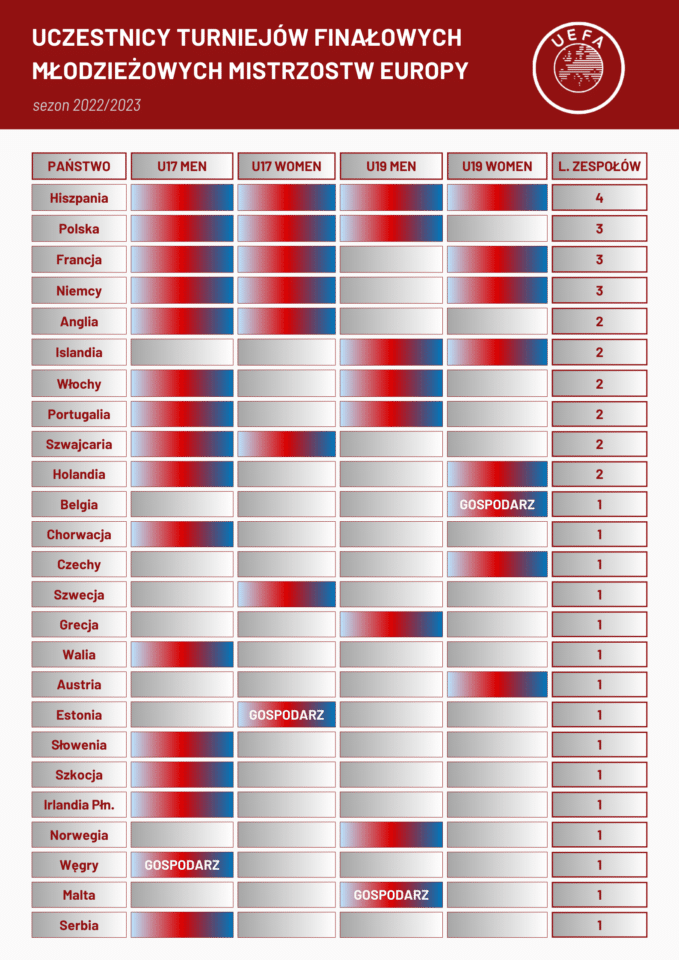 Dorna (pokazuje grafikę z zaznaczonymi awansami poszczególnych roczników z różnych krajów na turnieje finałowe): Dziś na mistrzostwa Europy awansuje osiem reprezentacji U-19 i szesnaście U-17. W tym pierwszym przypadku trzeba de facto znaleźć się w ćwierćfinale turnieju, by w ogóle na nim zagrać, a jednym tchem wymienimy drużyny, które w teorii muszą tam zagrać: Belgów, Szwajcarów, Hiszpanów, Portugalczyków, Niemców, Anglików, Francuzów, Włochów i już mamy komplet, nie mówiąc o Danii, Szwecji i innych dobrze szkolących krajach. A my przed rokiem na tym turnieju graliśmy. Patrząc na osi czasu od 2012 roku, przez 8 pierwszych lat mieliśmy trzy kwalifikacje na Euro U-17, w ostatnich trzech latach – trzy awanse. To jest progres. Chcemy uczestniczyć w turniejach finałowych, bo to doskonałe środowisko do indywidualnego rozwoju zawodników. A teraz zadaniem nas wszystkich jest zadbać o to, by tych zdolnych piłkarzy z piłki juniorskiej rozwinąć do wieku młodzieżowca, a później seniora.