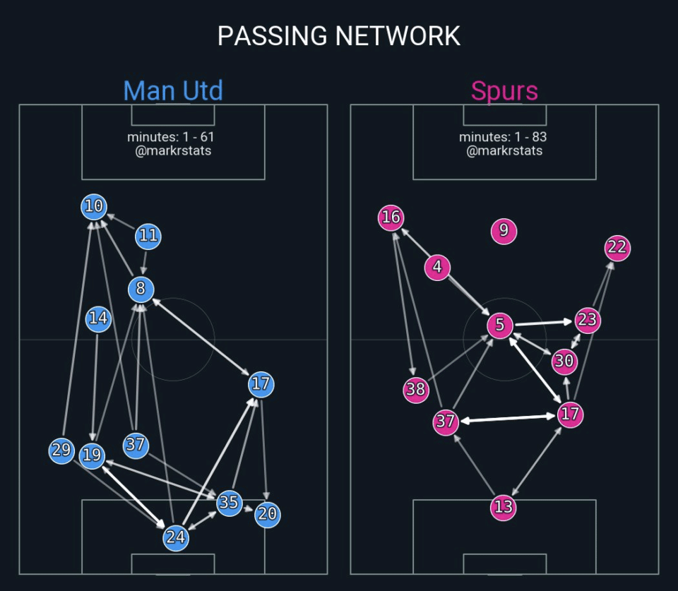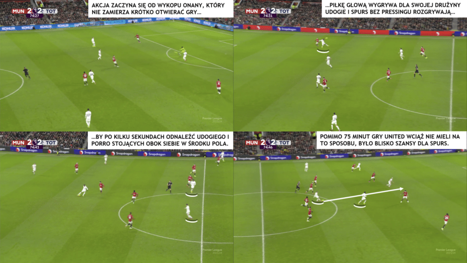 „Kiedy zawodnicy ofensywni nie zdobywają bramek, to odczuwa to cały zespół. Każdy czuje się mniej pewny swego, zaczynając od piłkarzy z przedniej formacji. Są mniej cierpliwi, nie mają tyle przekonania. A w obronie każdy tracony gol jest problemem”, komentował ten Hag występ swojej drużyny. Pierwszy w którym Hojlund i Rashford strzelili po golu. Ale to przekonanie piłkarzy nie wynika tylko ze skuteczności ich działań, lecz również z decyzji trenera. Przykładowo, Dalot miewał w tym meczu momenty w których schodził do środka tworząc przewagę w rozegraniu, ale jego rola szybko skończyła się, gdy Spurs kilka razy zagrali piłkę do Wernera i Portugalczyk musiał nadrabiać dystans. W Tottenhamie nawet po szarżach Garnacho czy Rashforda role Porro czy Udogiego się nie zmieniały. Bywały momenty, że niemal stali ramię w ramię w środku pola.