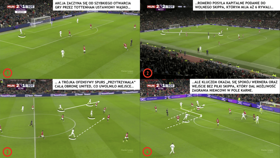 Kontuzje kontuzjami, ale styl gry zespołu to wybór trenera. To zbiór jego pomysłów i wyznacznik przekonania w jakość piłkarzy. Jeśli – jak Postecoglou – wierzy on, że trójka Hojbjerg-Skipp-Bentancur może dać grze Tottenhamu to samo, co podstawowa w składzie Sarr-Bissouma-Maddison, to nie zmienia stylu na konkretnego przeciwnika. Gdyby jego piłkarze mieli cień wątpliwości co do planu, to nie rozegraliby takiej akcji jak ta na 2:2 – z podaniem przez dwie linie od Romero, do rozegrania przez Skippa i Wernera, który zaliczył asystę do wbiegającego Bentancura. Była to wręcz modelowa akcja Tottenhamu, a ten Hag pieklił się, że przecież to wszystko swojej drużynie przedstawiał, a ona i tak była nieprzygotowana.
