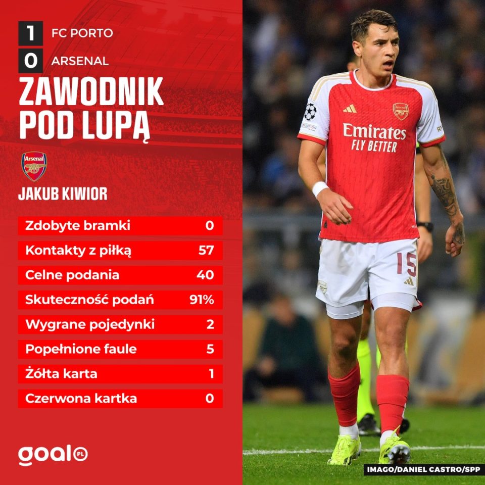 Środkowy obrońca przesunięty na bok także w bardzo nielicznych przypadkach stanowi o wartości dodanej w ofensywie. Tak, Kiwior zaliczył dwie asysty w ciągu swojej ostatniej serii występów, ale to były zagrania z własnej połowy lub nawet z autu, które wymagały jeszcze ogromnej pracy Leandro Trossarda i Kaia Havertza. Polak ma dobre, mocne podanie w przód, także z Porto próbował tak posyłać piłkę na przyspieszenie, ale średnio zdobywa on w ten sposób mniej przestrzeni niż np. Zinczenko czy Saliba.