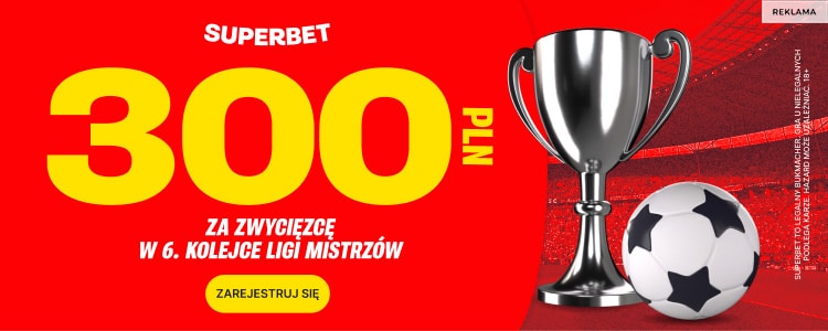 Przy okazji środowego meczu możesz także skorzystać z promocji Superbet i postawić zakład na zwycięzcę po kursie 150. Co trzeba zrobić, aby dzięki temu zgarnąć bonus 300 zł?