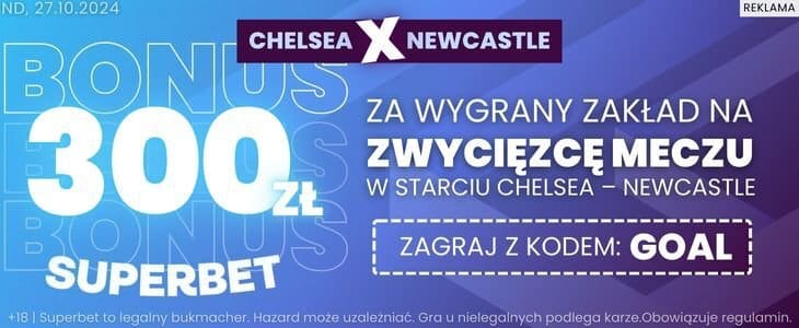W Superbet możesz teraz zgarnąć bonus 300 zł za poprawne wytypowanie zwycięzcy meczu Chelsea – Newcastle. Do skorzystania z oferty uprawnia kod promocyjny GOAL, który należy podać podczas rejestracji. Poniżej wyjaśniamy zasady oferty.
