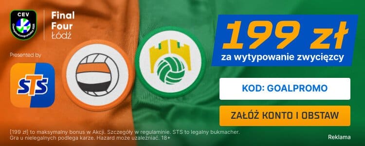 Specjalną promocję na mecze Final Four Ligi Mistrzów przygotował STS. Bukmacher oferuje bonus w wysokości 199 zł za typ na zwycięzcę meczu Jastrzębski Węgiel – Warta Zawiercie. Do skorzystania z oferty uprawnia kod promocyjny GOALPROMO, który należy podać podczas rejestracji. Poniżej wyjaśniamy krok po kroku jak skorzystać tej promocji.