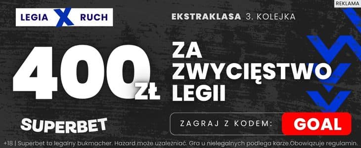 Czytelnicy goal.pl mogą skorzystać ze świetnej promocji w Superbet na niedzielne spotkanie. Rejestrując konto z kodem promocyjnym GOAL będziesz mógł postawić zakład na zwycięstwo Legii po kursie 200.00. Wyjaśniamy jak skorzystać z oferty.