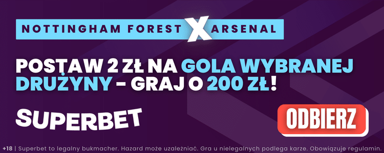 - Zagraj za min. 2 zł pierwszy zakład pojedynczy na gola wybranej drużyny w meczu Nottingham – Arsenal