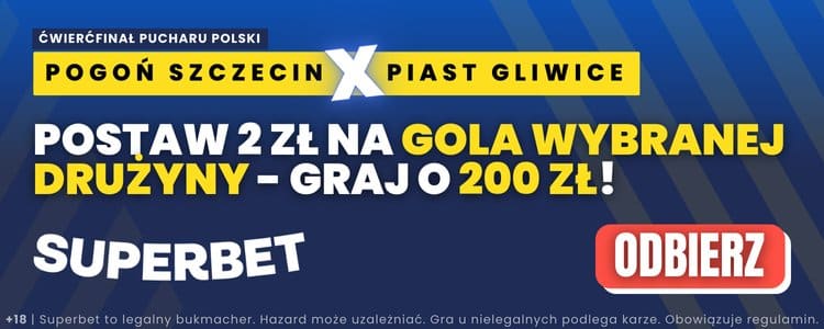 - Zagraj za min. 2 zł pierwszy zakład pojedynczy na gola wybranej drużyny w meczu Pogoń – Piast