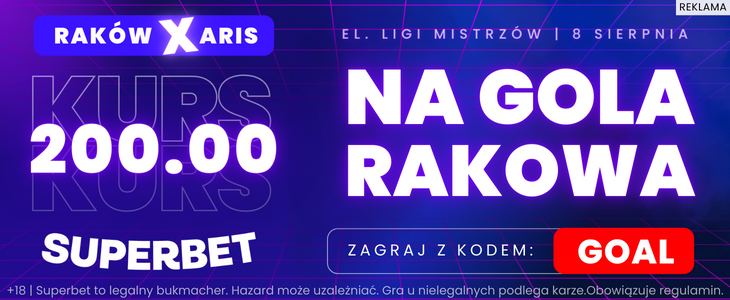 Superbet po raz kolejny przygotował świetną promocję na mecz Rakowa w europejskich pucharach. Rejestrując konto z kodem promocyjnym GOAL można postawić na gola Rakowa po kursie 200.00. Grając taki zakład za zaledwie 2 zł otrzymamy szansę otrzymania bonusu o wartości 400 zł. Jak skorzystać z tej oferty?