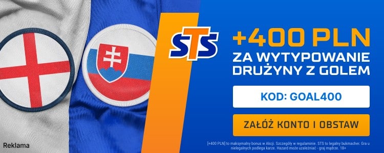 Kursy na wygraną Anglii nie są zbyt atrakcyjne, dlatego też warto zwrócić uwagę na świetną promocję STS. Bukmacher oferuje bonus o wartości aż 400 zł za wytypowanie gola dla Anglii lub Słowacji. Taki bonus możesz zgarnąć stawiając zakład już za 2 zł. Aby skorzystać z oferty należy podczas rejestracji w STS podać kod promocyjny GOAL400. Poniżej krok po kroku wyjaśniam jak skorzystać z oferty.