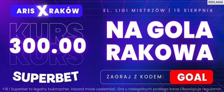 Zdaniem bukmacherów faworytem wtorkowego meczu rewanżowego jest drużyna Arisu. Kursy na wygraną Rakowa przekraczają aktualnie 3.00. Rozważając typ na tem mecz warto jednak skorzystać z promocji Superbet dostępnej i zagrać zakład na gola Rakowa po bardzo wysokim kursie 300.00. Możesz z niej skorzystać podając podczas rejestracji w Superbet kod promocyjny GOAL. Więcej informacji na temat promocji znajdziesz wyżej.