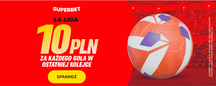 Przy okazji meczów ostatniej kolejki La Liga można skorzystać z ciekawej promocji Superbet i zgarnąć 10 zł bonusu za każdego gola, który padnie w 38. kolejce. Poniżej wyjaśniamy krok po kroku co trzeba zrobić.