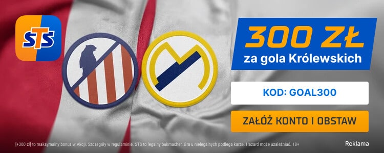 Spotkanie Atletico z Realem możesz również obejrzeć dzięki usłudze STS TV. Dostęp do niej uzyskasz rejestrująć konto w STS z kodem promocyjnym GOAL i stawiajać dowolny zakład za minimum 2 zł w ciągu 24 godzin przed meczem.