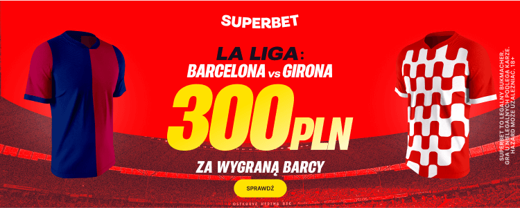 Aż 300 zł bonusu można zgarnąć w promocji Superbet, jeżeli spełnisz warunki i poprawnie wytypujesz wygraną Barcelony w niedzielnym meczu z Gironą. Oferta jest skierowana do osób, które założą konto z kodem promocyjnym GOAL. Jak skorzystać z tej promocji? Wyjaśniamy krok po kroku.