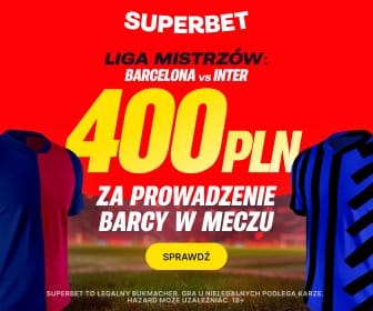 400 zł bonusu można zgarnąć również w specjalnej ofercie Superbet. Zakładając konto z kodem promocyjnym GOAL otrzymasz możliwość zagrania zakładu na prowadzenie Barcelony w dowolnym momencie meczu po kursie 200.00. Stawiając tylko 2 zł możemy dzięki tej ofercie otrzymać aż 400 zł.