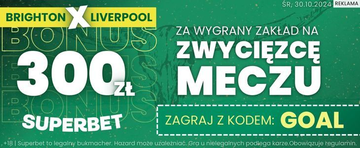 Przypomnijmy, że w Superbet nowi klienci będą mogli zgarnąć najwyższy dostępny bonus powitalny 3755 zł + 600 zł! Z oferty można skorzystać, podając podczas rejestracji w Superbet kod promocyjny GOAL. Dodatkowo zwycięzcę meczu Brighton – Liverpool można obstawić po kursie 150.00.
