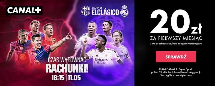 Drogą internetową transmisja dostępna będzie także na platformie streamingowej CANAL+. Teraz w specjalnej promocji za pierwszy miesiąc dostęp do pakietu Super Sport, pozwalającego także obejrzeć finał Ligi Mistrzów, zapłacisz tylko 20 zł. Później cena wzrasta do 69 zł, ale jest możliwość zrezygnowania z subskrypcji w każdej chwili.