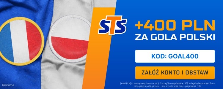 STS przygotował na ten mecz specjalną promocję dla kibiców reprezentacji Polski. Rejestrując konto w STS z naszym kodem promocyjnym GOAL400 i stawiając za tylko 2 zł zakład na choćby jednego gola Polski, możesz zgarnąć dodatkowo 400 zł. Więcej informacji o tej ofercie znajdziesz wyżej.