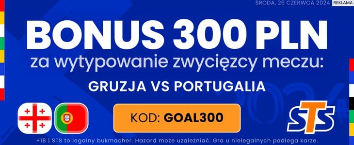 Portugalia jest wyraźnym faworytem środowego spotkania, dlatego też warto zwrócić uwagę na promocję STS. Dzięki niej możesz otrzymać extra bonus 300 zł za wytypowanie zwycięzcy meczu Gruzja – Portugalia. Możesz go zgarnąć stawiając kupon za zaledwie 2 zł. Z promocji skorzystasz rejestrując konto w STS podając kod promocyjny GOAL300. Poniżej wyjaśniam krok po po kroku jak skorzystać z promocji.
