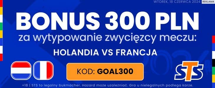 Jeżeli nie jesteś jeszcze klientem STS, możesz skorzystać ze świetnej promocji. Stawiając tylko 2 zł możesz zgarnąć aż 300 zł za wytypowanie zwycięstwa Holandii lub Francji. Z oferty możesz skorzystać zakładając konto w STS z kodem promocyjnym GOAL300. Więcej informacji o ofercie znajdziesz wyżej.