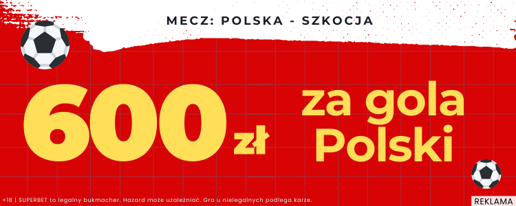 Można powiedzieć, że bukmacher Superbet nie wierzy w reprezentację Polski. Oferuje bowiem aż 600 zł bonusu za trafiony typ na gola Polski w poniedziałkowym meczu ze Szkocją. Taką kwotę można zgarnąć stawiając zakład za 2 zł. Poniżej wyjaśniamy krok po kroku jak skorzystać z oferty.