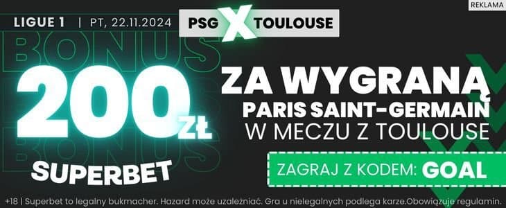 Faworytem piątkowego spotkania są gospodarze, czyli absolutni pretendenci do sięgnięcia po mistrzostwo Francji. Kurs na zwycięstwo Paris Saint-Germain wynosi około 1.35, a typ na wygraną Tuluzy to mniej więcej 7.50. Natomiast kurs na remis w tym pojedynku jest szacowany w granicach 5.50. Kod do Superbet na darmowy zakład 35 zł to GOAL.