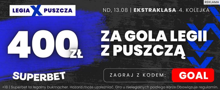 Legia Warszawa przystąpi do niedzielnego spotkania w roli faworyta, ale w żadnym wypadku nie może zlekceważyć przeciwnika. Na niekorzyść drużyny Kosty Runjaicia działa pucharowa porażka, a co za tym idzie czekający ją w przyszłym tygodniu bardzo ważny rewanżowy pojedynek, który jest teraz priorytetem. Nie mniej jednak Legia do Krakowa, gdzie rozegra mecz z Puszczą jedzie z zamiarem zdobycia kompletu punktów. My w przypadku tego meczu korzystamy z promocji Superbet pozwalającej zagrać zakład na choćby jednego gola Legii po kursie 200.00 (szczegóły niżej). Nasz typ: gol Legii