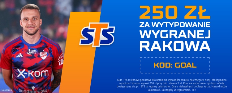 Jeden ze sponsorów Rakowa – bukmacher STS przygotował na środowe spotkanie bardzo ciekawą promocję. Rejestrując konto z kodem promocyjnym GOAL będziesz mógł postawić zakład na zwycięstwo Rakowa po bardzo wysokim kursie 125.00. Stawiając 2 zł masz więc szansę odebrać bonus o wartości 250 zł. Poniżej wyjaśniamy krok po kroku jak skorzystać z oferty.