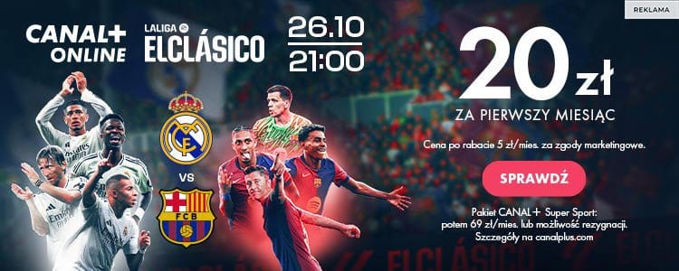 Drogą internetową mecz będzie można oglądać także w usłudze CANAL+ online. Teraz dostęp do pakietu Super Sport, dzięki któremu obejrzysz El Clasico, ale także wszystkie mecze Ligi Mistrzów, możesz uzyskać w cenie 20 zł za pierwszy miesiąc. Z oferty, która obowiązuje tylko do 26 października, można skorzystać rejestrując konto za pośrednictwem naszej strony.