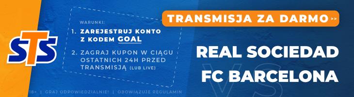Mecz Real Sociedad – FC Barcelona można również oglądać za darmo online. Taka transmisja będzie prowadzona na internetowej stronie bukmachera STS. Aby uzyskać do niej dostęp wystarczy zarejestrować konto w STS podając kod promocyjny GOAL oraz zagrać dowolny kupon w ciągu ostatnich 24 godzin przed meczem.