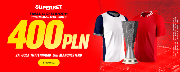 - Postaw pierwszy po założeniu konta zakład pojedynczy za min. 2 zł obejmujący typ na gola wybranej drużyny w finale Ligi Europy. Zakłady zaliczane do promocji to: Liczba goli drużyny – Tottenham – powyżej 0.5 lub Tottenham strzeli gola – tak lub Liczba goli drużyny – Manchester United – powyżej 0.5 lub Manchester United strzeli gola – tak.